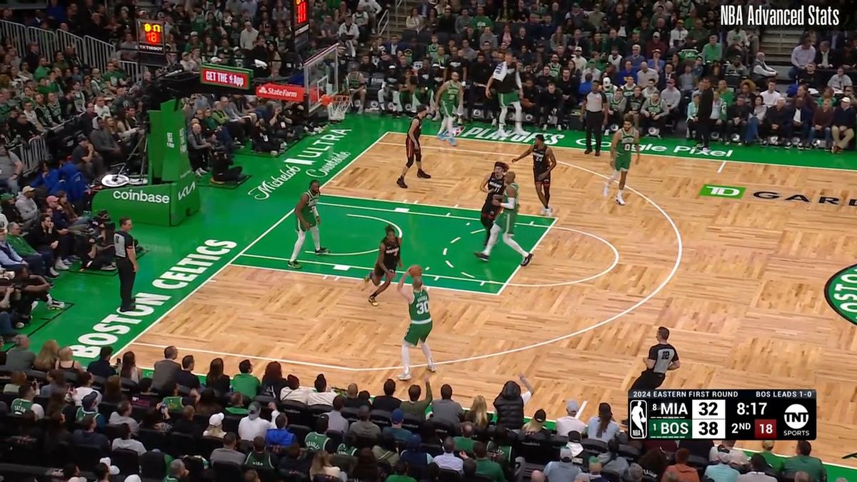 At 8:44, Al Horford hit a left-corner 3-pointer to put Boston up 38-32. It was part of a 13-4 run for the Celtics, and they were starting to get some momentum. Miami had come out hot from 3 but Boston was suddenly building a lead. It was an early “uh oh” moment for the Heat.
