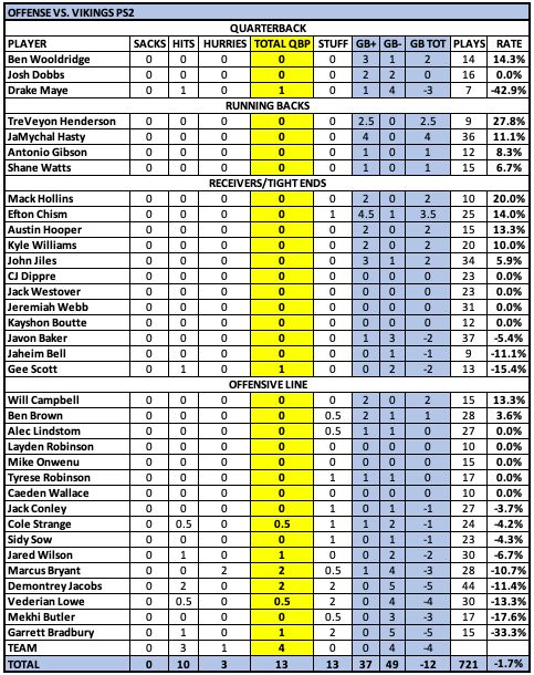 Josh Dobbs had a couple of good plays against pressure, and poor throws to Javon Baker and Kyle Williams (put him in harm's way). That's the way it seems to go with him. Just very inconsistent, which is why he's a career backup and never a starter. ... I continue to be impressed with Ben Wooldridge. He has a throw a game — the out to Baker in this one — that makes me sit up in my chair. Maybe's there's something there. I'll say this, and will probably take heat for it: Wooldridge's throwing motion is way better and efficient than Maye. I wish I could give it to Maye. He'd be unstoppable.
