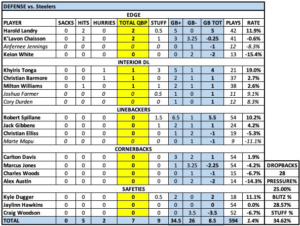 Not nearly enough pressure in this game, although that has to do with Rodgers' quick release/quick game and not wanting to get hit. I had only a 25% pressure rate, and NGS had them at 16.7% — by far the worst in the league. ... Harold Landry and Khyiris Tonga were terrific in this game. Everyone else was subpar. ... How many more times is K'Lavon Chaisson going to be allowed to be offsides? ... The depth was not good either. Keion White again struggled in his return, and Anfernee Jennings gave up a big run edge.
