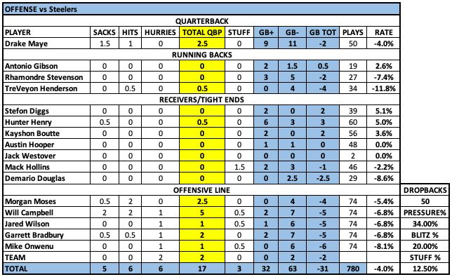 I mean, it was OK overall. Will Campbell had more good reps than bad ones against the very capable Nate Herbig, but the misses were pretty big late in the game. ... Initially thought Morgan Moses struggled against TJ Watt, but I thought Moses more than held his own and two of the pressures allowed came with chips from Henry, and they weren't great. ... Garrett Bradbury had a great block to save a quick game. Came out of nowhere and laid out. This was his roughest game. You could really feel how undersized he was against the big Steelers interior. ... Jared Wilson was solid, had some really good reps. Seems to be improving by the game now. ... Mike Onwenu continues to be confounding. He had a whiff that contributed to a Stevenson fumble, and the illegal downfield penalty that wasn't close, which was basically a 22-yard infraction. He's not playing up to his contract.