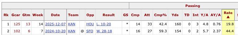 That was the second time in his career that Mahomes put up a passer rating less than 50.