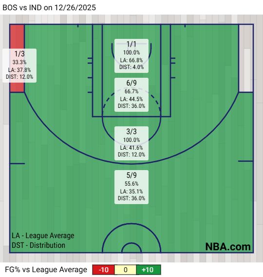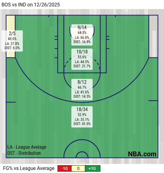- Hot shooting: The Celtics shot 51% from 3, powered by Sam Hauser’s 7-8 night. They hit 20 3-pointers, but the story of this game might actually be the mid-range shooting. Look at these shot zones.