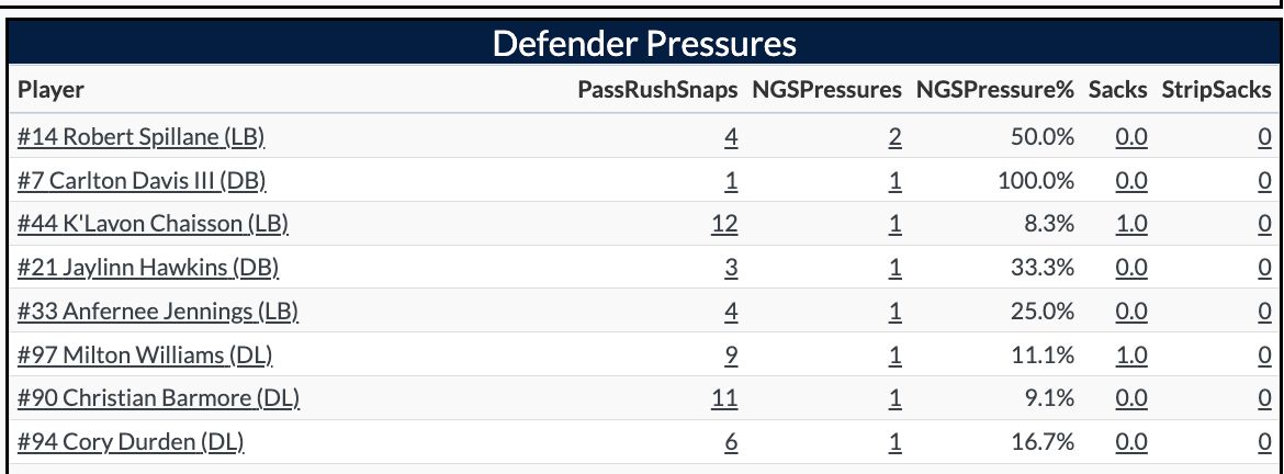 The Patriots blitzed and got pressure on Herbert 39% in the first half, with most of it coming late. This is where the pressure came from in the first half: