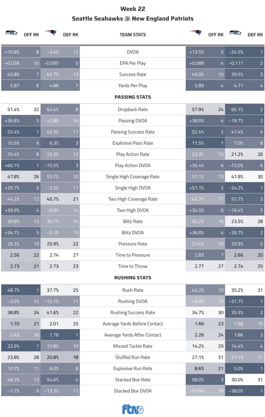 Seattle puts the special in special teams: Rasheed Shaheed is one of the league's most dangerous punt and kick returners, while the Patriots are 23rd in EPA per kickoff and 30th in EPA per punt this season. Seahawks punter Michael Dickson and kicker Jason Meyers both have the edge over Bryce Baringer and Andy Borregales. In a game expected to be tight, special teams could swing it with a big play.