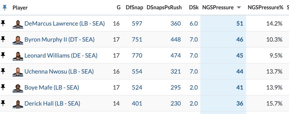 The stunts and games from the Seahawks: We went over that already. They have five players with at least 40 pressures this season, and the Seahawks are one of the lowest blitz rate teams in the league. These guys work well together, and they pressure the quarterback consistently.