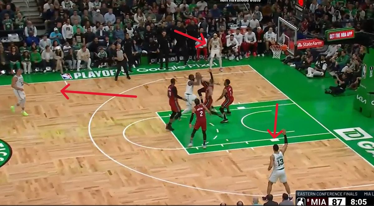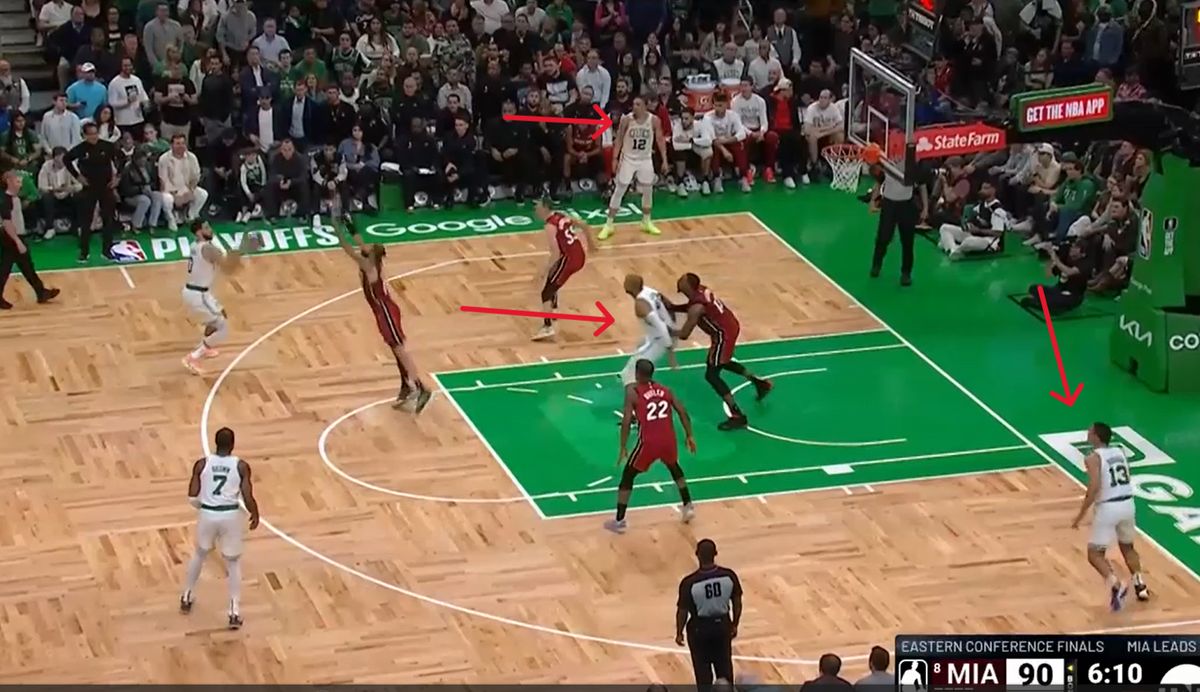 The Celtics have to be aware of not falling for the “good shots” when great shots are available. Miami is being overly aggressive in trying to attack Tatum and Brown, and the Celtics are letting them off the hook. For example: