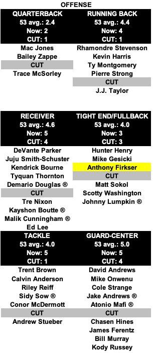 TE Anthony Firkser: Have always liked his all-around game and the Patriots needed a better third option than Matt Sokol, who is serviceable and that's about it. Firkser is a legit third tight end and he's made the transition quickly, so I had to create a spot for him. We only had two TEs on the first installment.