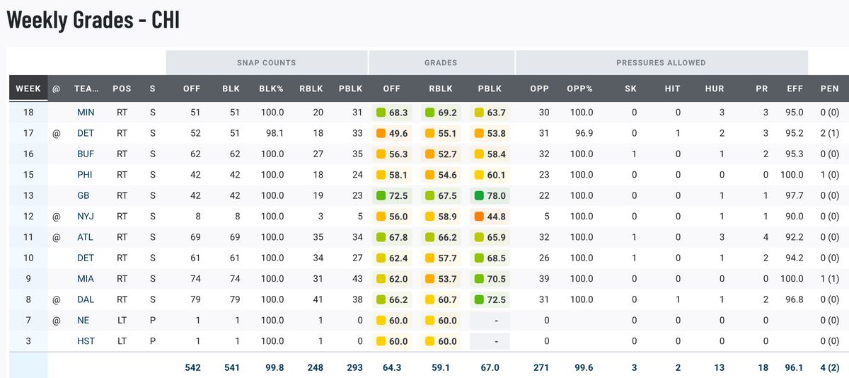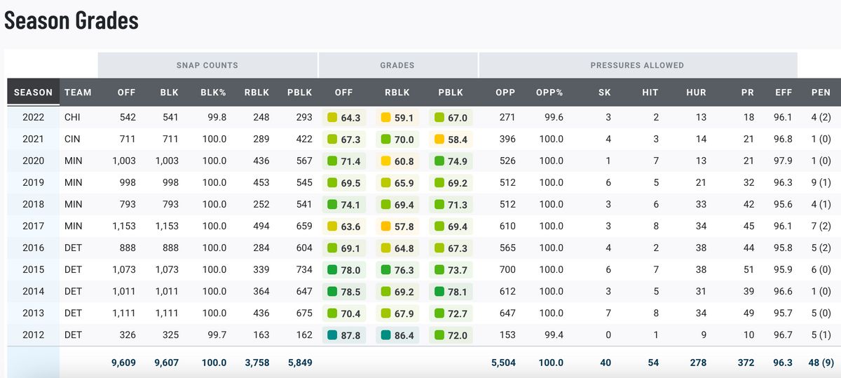 Look, if Reiff is your starting RT for a dropback pass team (the Bears offense with Justin Fields did not fit him) and there's a good LT on the other side who doesn't need help, you could probably do worse. But with LT an issue, Reiff will be an issue. He needs some help, but not a ton because he has veteran savvy (he loves to pull/hold the arm when he gets beat but gets away with it).