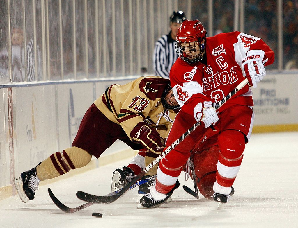 BOSTON - JANUARY 08: Kevin Shattenkirk #3 of the Boston University Terriers takes the puck from Cam Atkinson #13 of the Boston College Eagles on January 8, 2010 during the Sun Life Frozen Fenway Hockey Game at the Fenway Park in Boston, Massachusetts. The Terriers defeated the Eagles 3-2. (Photo by Elsa/Getty Images)