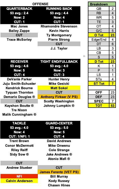 We have now seen eight practices so far in Patriots training camp (the in-stadium thing doesn't count), so it's a good chance to reset where we see the roster going when it comes to final cuts. Remember, teams can elevate three players every week from the practice squad, with the ability to retain veterans, so it's basically a 56-man roster for a while.