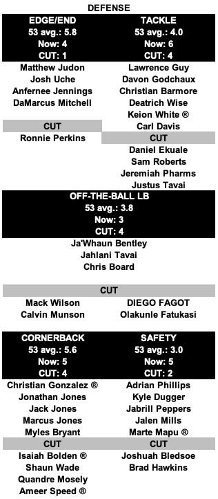 61. DE Ronnie Perkins: He's had a pretty good camp to this point and you wonder if he might pop late like Josh Uche did.
