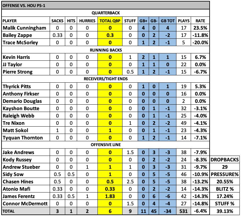 Let's start with Bailey Zappe. I thought, overall, he played fine in this game. Didn't have him for any plus plays — the pass to Tyquan Thornton was fine, but it wasn't a good or great play — and two minus decisions on the first drive. Other than that, he did what was expected.