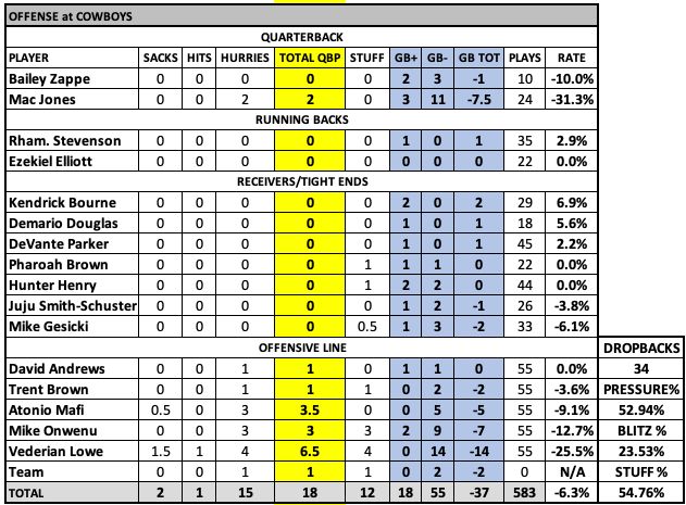 First and foremost, the Patriots' offensive line was completely dominated by the Cowboys. They allowed a pressure rate of 52.9 percent — by far the most of Jones' career. You're not winning an NFL game with a pocket passer with a pressure rate like that. Period. The run blocking might have been worse, with a 54.7 run stuff percentage.