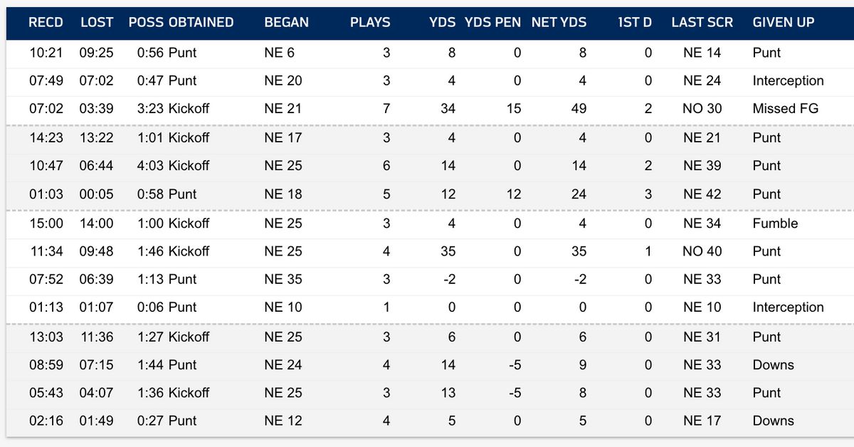 The Patriots have gone 34 consecutive drives without a touchdown. Deepest penetration was the Saints' 30.