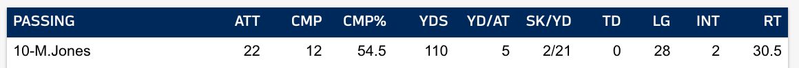 Jones was later picked again, although it was a drop by Ty Mongtomery. Bailey Zappe entered on the next possession.