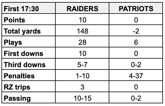 - Patriots special teams saw Sam Roberts commit a personal foul on said field goal, on 4th and 11, to give the Raiders new life. Vegas still only got a field goal.
