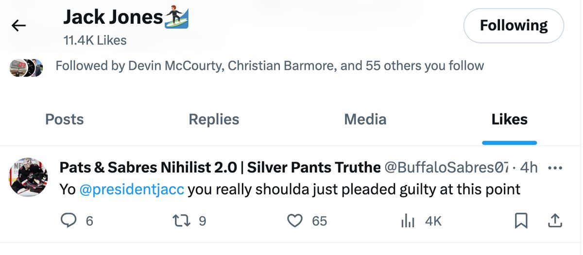 Jones, like Jackson, returned from whatever exile this was and played a fair amount of snaps the rest of the way, but unlike his fellow cornerback, he never even appeared in the locker room; his locker half-opened but with no signs of life. Jones did post a video of himself singing on Instagram (stories), but I can't decipher what, if anything, that was all about. He also liked this post on X: