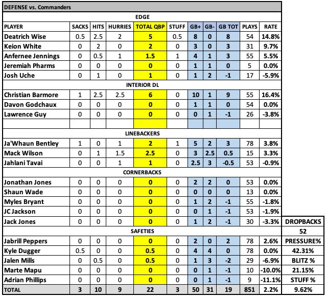 This unit is really struggling. Six missed tackles, another six big-time mistakes in coverage. The introduction of JC Jackson has not helped that much and it makes them more undisciplined. ... At this point, the only players I trust to be in the right spot are Jabrill Peppers, Jonathan Jones and Myles Bryant. Peppers and Bryant are just limited and slot up a spot higher due to injuries. ... This was another game where Kyle Dugger stands out on a handful of plays, and then he frustrates you on another handful - including two missed tackles.