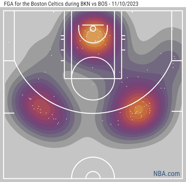 The Celtics are very much a modern NBA team. They shot 52 3-pointers and 42 2-pointers in their win over Brooklyn. Two players took double-digit 3-point attempts. A look at their heat map shows the basic, preferred shot distribution: 3-pointers and layups.