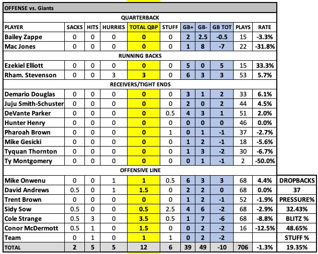 Patriots should have run more in this game but I'm sure Bill O'Brien, like most OCs, views the quick game as the wide aspect of the running game. I used to disagree with Mike McCarthy on this in the past, and I'm still there. ... Stevenson and Elliott both had live legs after the bye and their vision is terrific. Stevenson continues to finish runs impressively. ... Stevenson bailed out Cole Strange on the first interception, but Stevenson still allowed three hurries against Wink Martindale's blitz-heavy scheme. His pass pro needs to be better.