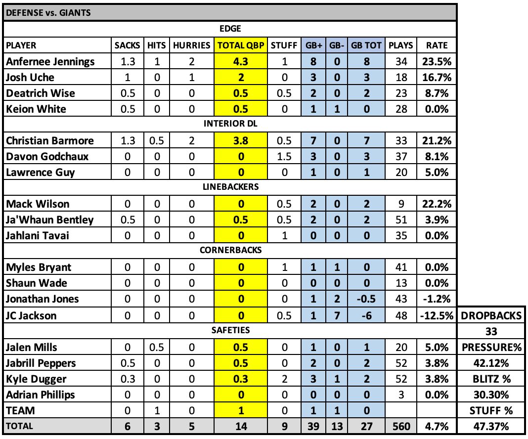 Take Jackson out of this group and you're looking at 4 out of 5. ... Obviously Jonathan Jones missed the tackle on the lone touchdown, but why the all-out blitz on third and 10? Why put him in that position? Giants have some pretty big and physical receivers. ... New York left some plays on the field down the middle. ... Would say half the Patriots' sacks came as a result of really good coverage.