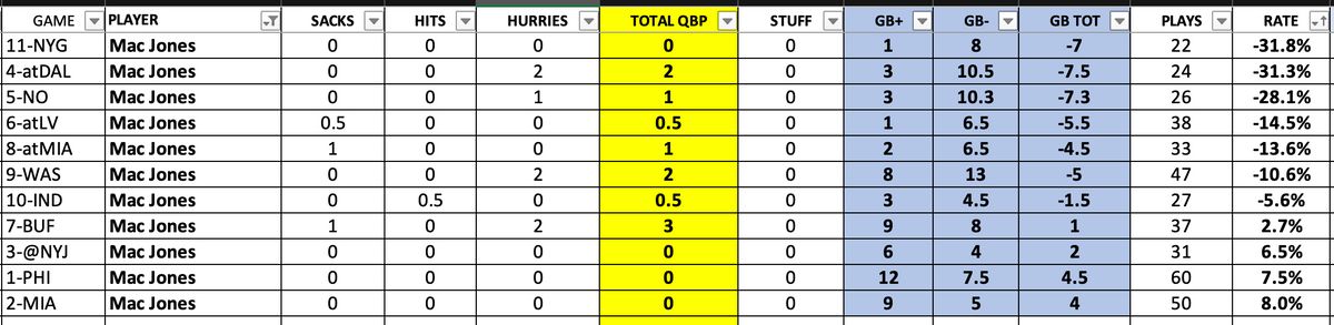 The two quarterbacks only combined for 3 plus plays: Mac Jones' 3rd and 5 throw in a tight window to DeVante Parker, and Bailey Zappe's 5-yard throw against pressure to Juju Smith-Schuster and his scramble out of a sack/throw to Rhamondre Stevenson. ... Of Zappe's 15 dropbacks, seven were screens and four used playaction, so he only had four straight dropbacks (26.7%). ... Jones had 22 dropbacks. Six were screens and six had playaction, so 10 straight dropbacks (45%). That shows you the level of confidence Bill O'Brien has in Zappe - not much. ... Jones had two minus decisions — they weren't horrible because checkdowns to Stevenson resulted in gains, but Parker and Smith-Schuster were better options on those plays. ... The Patriots have reduced themselves to a high school-level offense with very simple downfield passes, a ton of quick game, and running the ball. Malik Cunningham can run this offense and has the added element of running. ... As I've remarked before, the best part of Zappe's game is his timing in the pass, screen and playaction game. His fakes and movements are much better than Jones and enhance those elements for the team. Jones isn't patient enough with those so his fakes are terrible and ineffective. ... Zappe also doesn't have the pocket PTSD Jones obviously plays with. It's clear Zappe is the best option at quarterback at this point, not that it's a good option. Cunningham should be in the mix more.