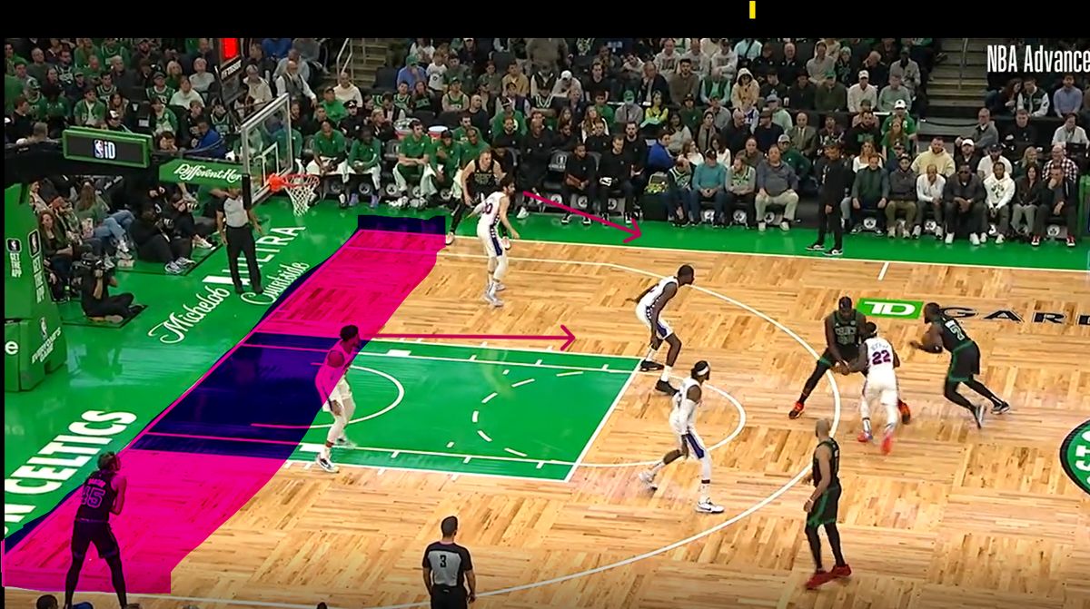 He’s running in from the corner. He’s on the move. Four Sixers are facing the basket, which means if they are actually able to secure the rebound, they have to stop, plant, turn, and run in the other direction.