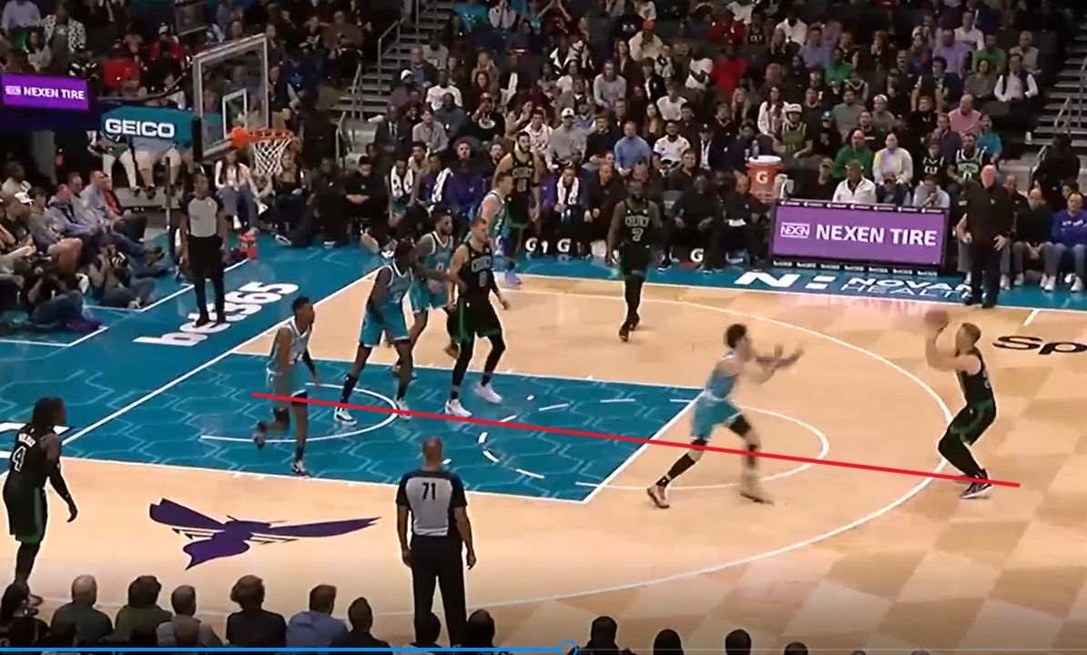 Here, Holiday has the choice to go baseline on the corner crash, but Hauser is basically shooting from the top of the key. Again, rebounders generally assume the ball is going long off the rim. On a basically straight-on 3-point shot, there's a good chance a rebound will come to the middle of the floor. So let’s draw a straight line down the floor.