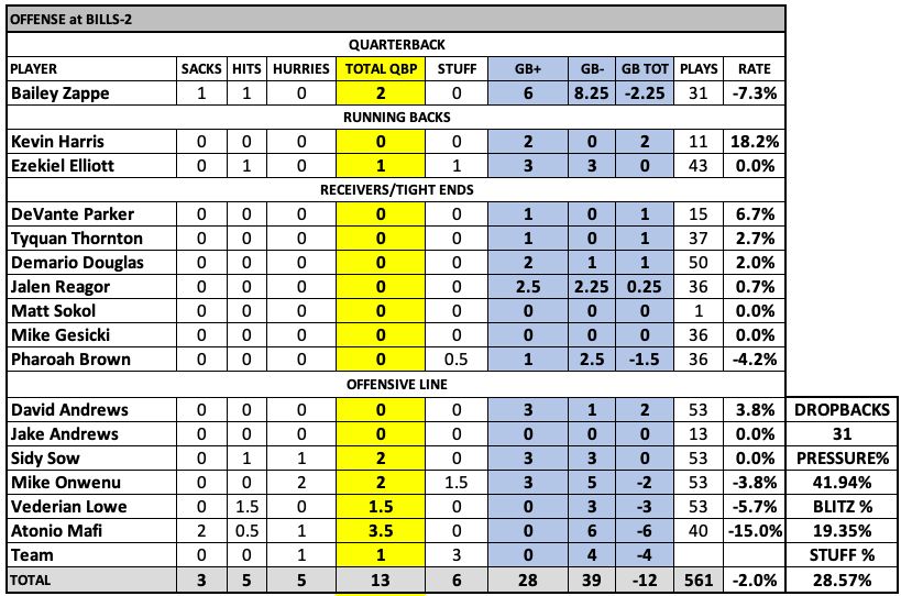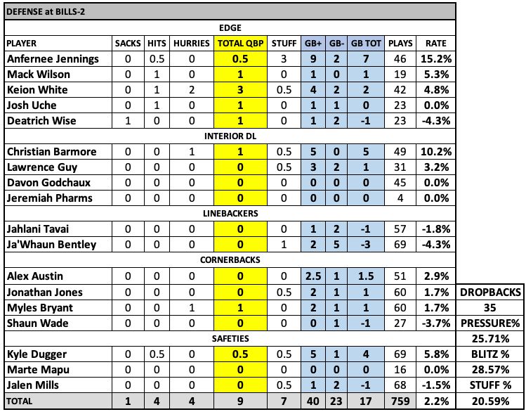 Atonio Mafi again struggled as he continues to look more like a developmental player than backup. ... Mike Onwenu had his first rough game in a while as Leonard Floyd was a pain in the ass for the Patriots. ... David Andrews was outstanding again and would really be helped by Mafi being better with his footwork. ... Sidy Sow continues to show well, and Vederian Lowe has quietly been doing a solid job the past two games.