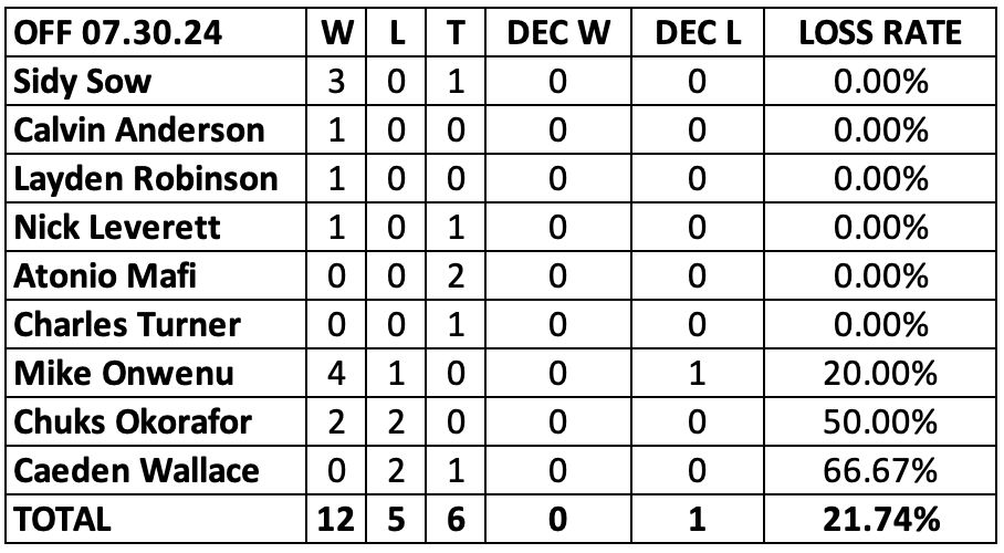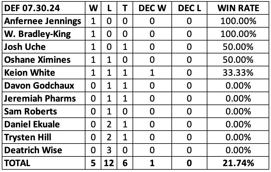 But, in any event, the offensive line won 12-5-6 with Sidy Sow (3-0-1) and Mike Onwenu (4-1) the most impressive. On the flip side, Deatrich Wise was 0-3.