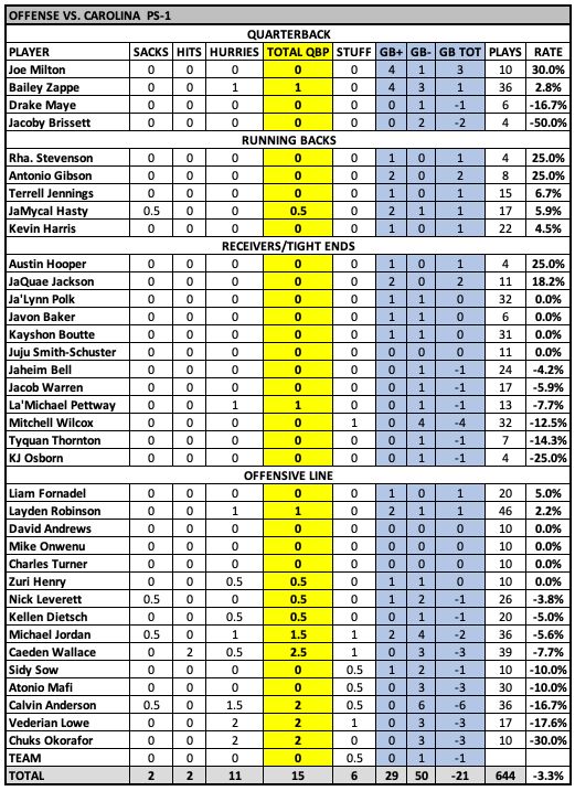 Austin Hooper didn't play much, but he had a dynamite seal on the linebacker on the first play of the game. ... JaQuae Jackson keeps showing up with nice route running as he drew a PI and scored the touchdown on the same out-and-go. ... Rookies Ja'Lynn Polk and Javon Baker were solid in their debut. There wasn't much down the field against a Panthers defense that was playing a lot of Cover 4 and 3 deep zones. The underneath stuff had to be taken. Polk had one poor run block, and Baker had a poor, round-off route on the 2nd and 5 incompletion with 11:40 left in the second quarter. If he was better at the top of the route, that's an easy completion. ... Juju Smith-Schuster just had nothing in the legs and now he is gone. ... TE Mitchell Wilcox continued his rough camp with two drops, a bad run block and a holding penalty/stuff.