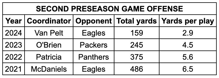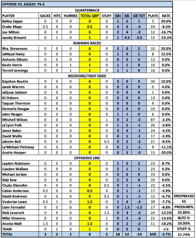 Before we break down Maye play by play, don't just ignore the fact that overall this offense (putting aside the quarterbacks) is a mess. I mean, they had 159 yards and averaged 2.9 yards per play against an Eagles defense that used just a handful of starters. Compare that to recent second preseason games for the Patriots: