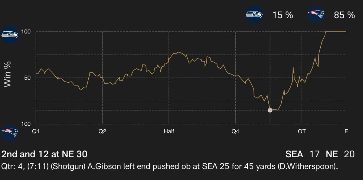 The sack of Brissett/blocked field with 4 minutes left. If the Patriots convert the third down, they control the game. If they get the field goal, the Seahawks after to score a touchdown and that's more opportunities to get off the field.