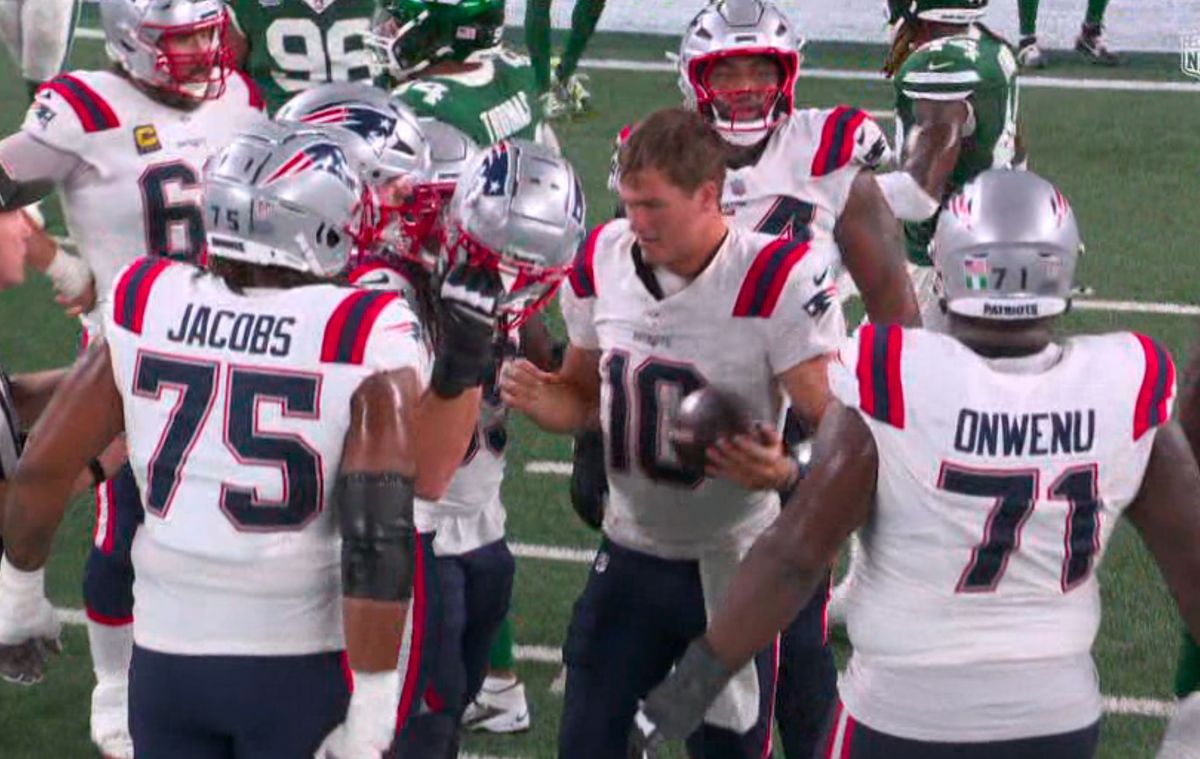 I mean, just in his 12 dropback stint against the Jets, who weren't exactly sitting back calling four blitzes, Maye was planted into the MetLife turf by Jamien Sherwood, had his arm hit while releasing one pass, Malachi-crunched on two sacks by the Jets - and the last one that ended the game knocked his helmet off.