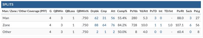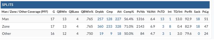 You'll notice the 10.0 yards per attempt in zone (107.1 passer rating), and 5.3 in man coverage (and, yes, the 49ers can skew a lot of stats for opposing defenses).