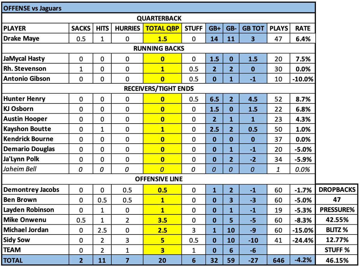 Decision - Maye is sacked on first down against a blitz and no blocking help (I think Rhmaondre Stevenson was supposed to stay in but does not) as the Jaguars cover Hunter Henry's out and up well. On second down, Maye's low and behind throw limits Henry to just 5 yards otherwise it might have scored (not a minus play). ... On 3rd and 10, the Jaguars have one of the worst defensive playcalls I've ever seen in this situation - asking standout end Josh Allen to cover the back who's aligned on the other side - and predictably, it does not work out well for them. I was impressed that Maye saw the zone blitz coming and got the ball out to Hasty. This shouldn't have gone for a touchdown, but it was that bad of a defensive call.