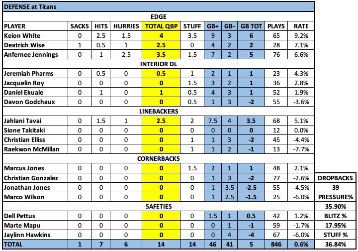 Thanks to a lack of consistent pressure up front, due in part to Callahan's scheme, this group had a tough time with Rudolph. He completed 74% of his passes at 9.0 yards per attempt when not pressured. And he completed 70% at 9.4 YPA against the blitz. ... Jaylinn Hawkins had two really poor coverages in zone, and jumped a tight end to leave Christian Gonzalez hung out to dry by Calvin Ridley. ... Jonathan Jones allowed a TD but he was left by himself on the left side of the field when there were six defenders against two receivers on the other side. That shouldn't happen. ... Marco Wilson allowed a touchdown and had a missed tackle. ... Dell Pettus had a big run tackle that saved a touchdown and was a four-point play. He's been on the upswing.