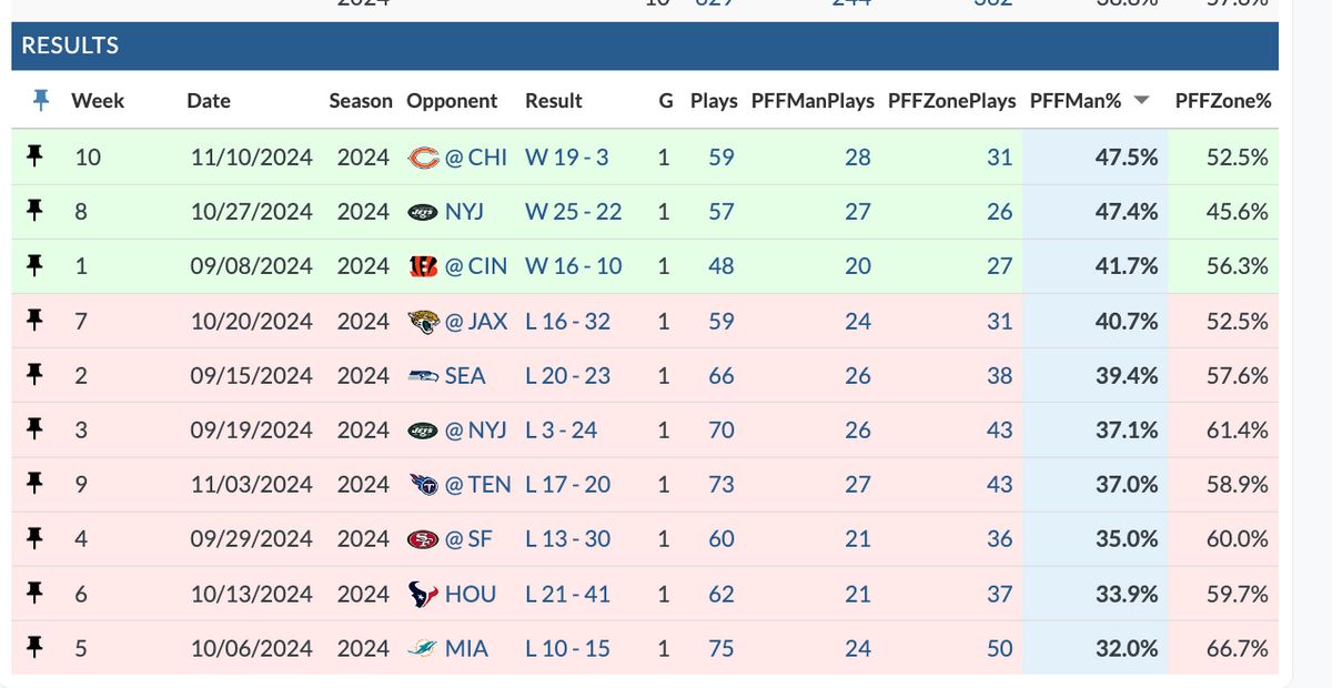 Of course, the gameball goes to DeMarcus Covington/Jerod Mayo and the defense (with an assist to now-fired Bears offensive coordinator Shane Waldron) for just smoothing the Bears. Deatrich Wise, Keion White, Anfernee Jennings and Jeremiah Pharms absolutely dominated the undermanned Bears offensive line. Covington seemed to solve some back end coverage issues with Jonathan Jones getting 22 snaps at free safety —where coverage busts from, especially, Jaylinn Hawkins had been a growing issue. And as we've been pounding the table for, the Patriots played their highest percentage of man coverage this season. I wonder what the top three games in man coverage percentage have in common in the following chart?