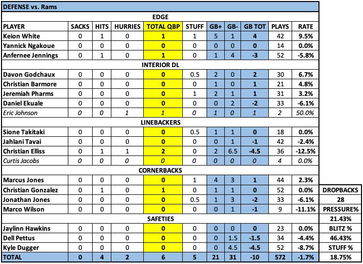 Keion White was really good. Other than that? Not good. It wasn't awful (aside from Daniel Ekuale against the run again), but they barely got any pressure against a struggling Rams offensive line (tighter coverage plan would help as well). ... This was the worst run edge game that I've seen from Anfernee Jennings in some time. That was a big surprise. ... Christian Barmore made a couple of run plays, but joined Yannick Ngakoue in doing nothing against the pass.