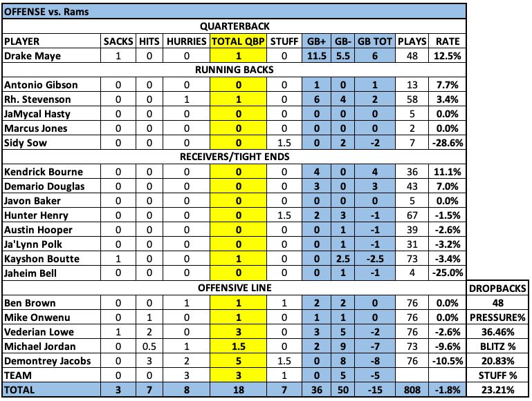 OL Jacobs, Jordan & Lowe: Very rough outing for this group. And imagine if Maye didn't have his best snap-to-throw mark of the season?