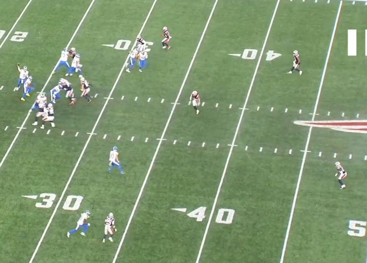 Nacua motions out and back into trips as the Patriots are in man coverage. They stay locked onto their players instead of passing them off and Christian Gonzalez is easily rubbed and it's an easy gain. Had to have a good plan against trips and didn't.