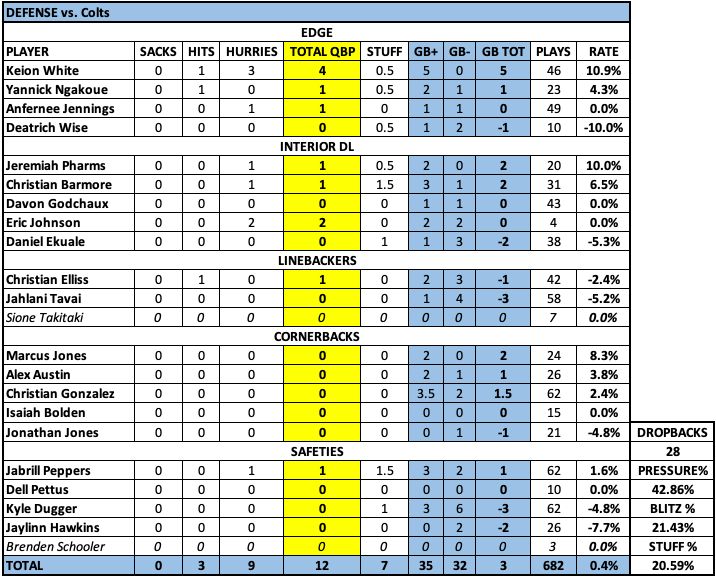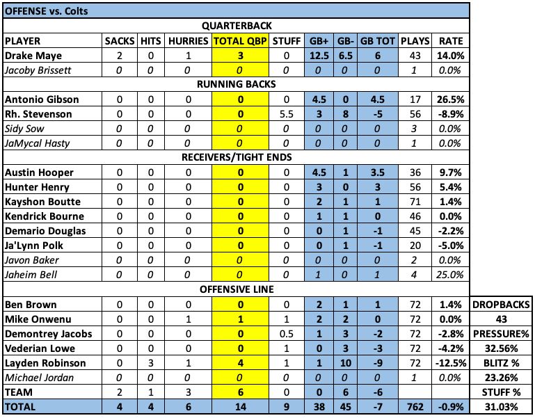 RB Rhamondre Stevenson: In his first eight games, Stevenson was responsible for 1 stuffed run and had a plus/minus of 40.5/14. In the last three, he has 8 stuffs and is 13/18. Injured or just lost confidence?