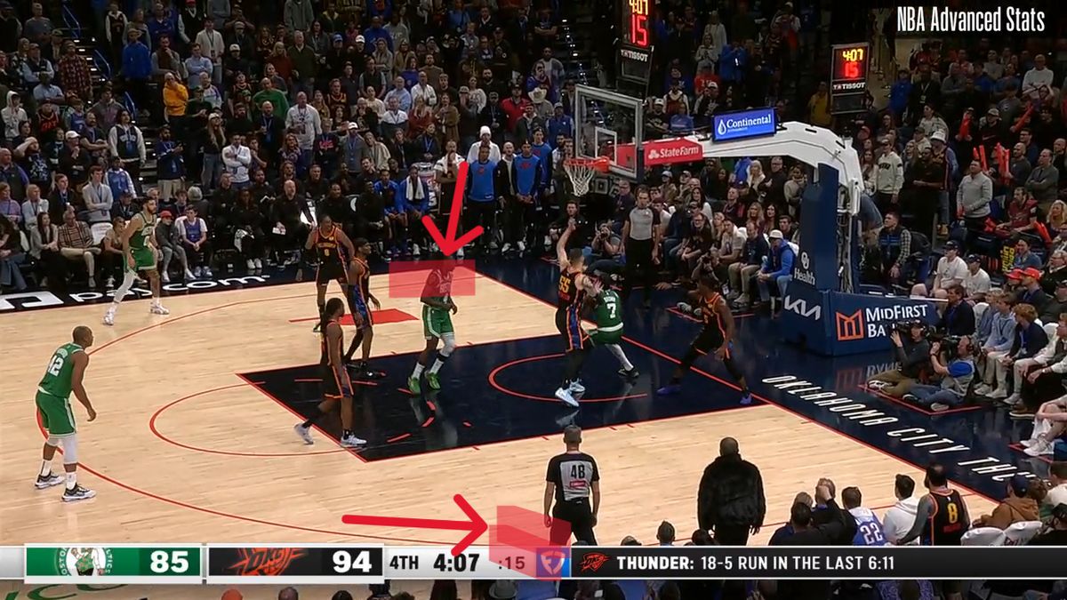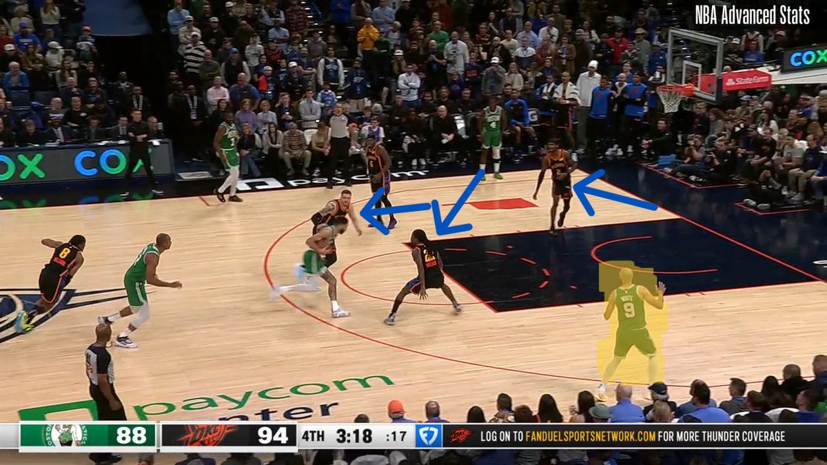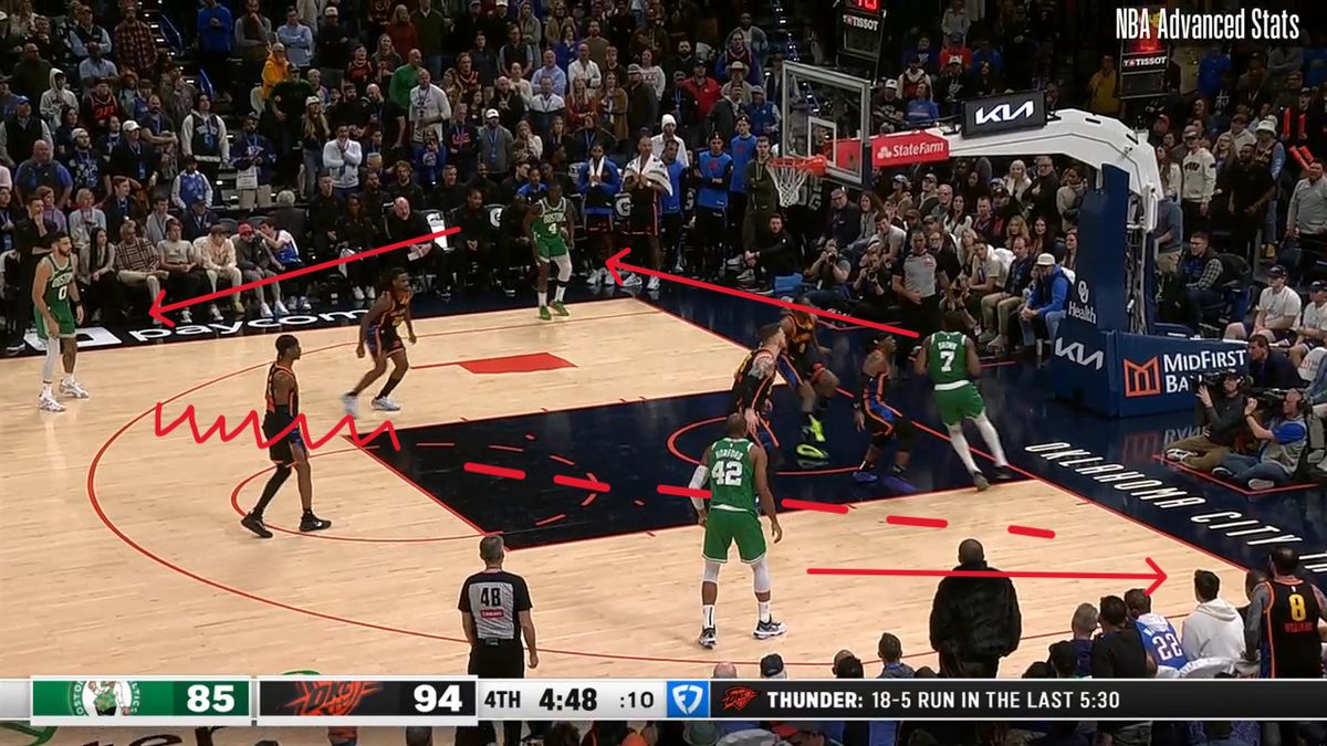 Brown is gathering with THREE Thunder defenders on him yet he still goes up for the shot. Because he's Jaylen Brown, he still almost make it, but that play is screaming for a pass to Holiday in the corner. If that's open,he shoots it, otherwise, it's a pass to Tatum. If Tatum is open, he shoots it, otherwise, it's a dribble drive to the middle. He'd have three options in the middle. I have diagrammed a kick to Horford, who would undoubtedly be alone in the corner, but he could obviously try to finish if the rim was open, or he'd probably have Brown again, either waiting in the dunker spot or rotating out to the left corner.