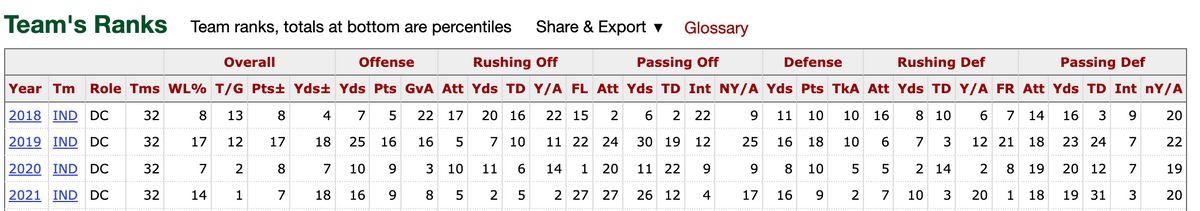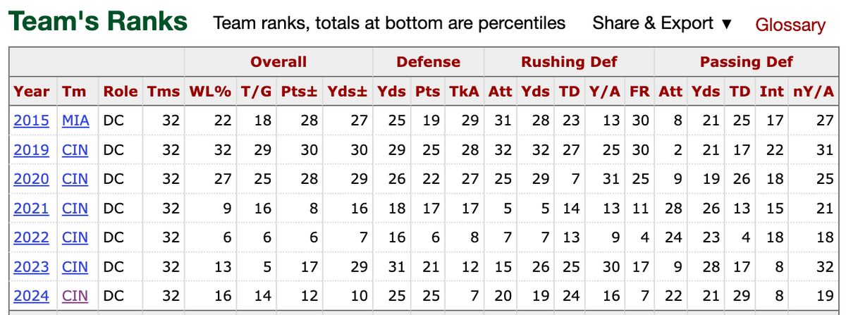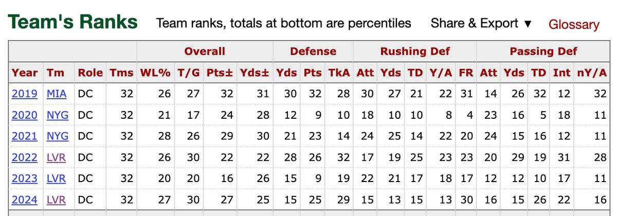 Con: Points ranking as OC - 14, 18, 30, 27. Far from a QB guru.
