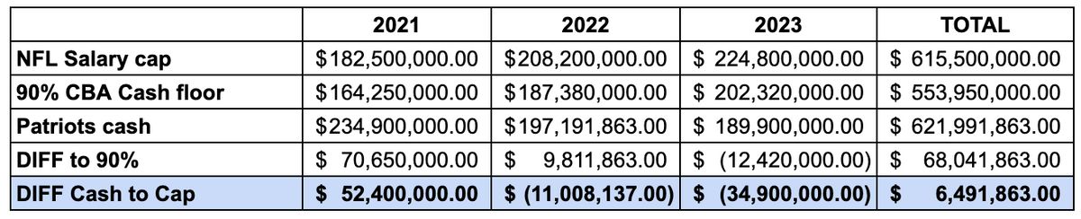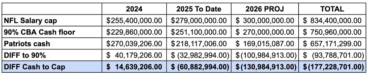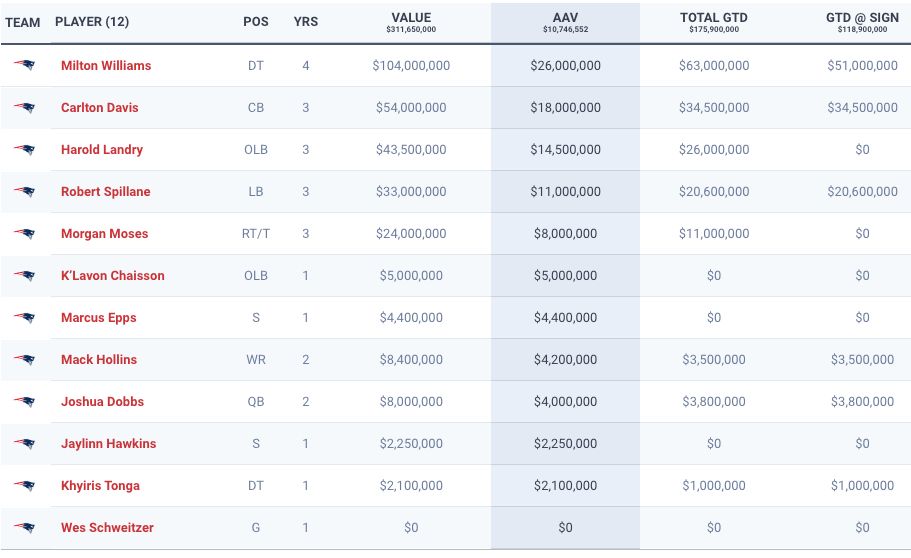 The Patriots are a cash-to-cap team, which means their annual budget is the cap. Robert Kraft has said the Patriots can spend over that, but they want the spending to smooth out over the three years required.