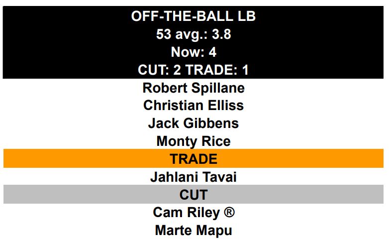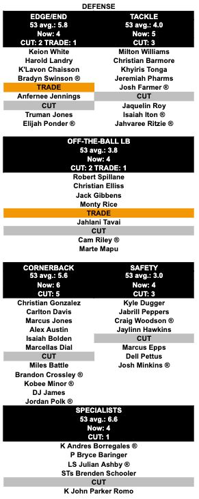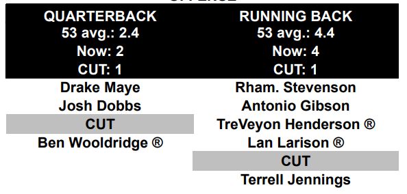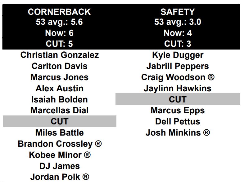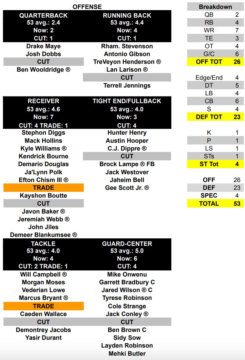 The only name I really debated over was Antonio Gibson. For now, I am keeping him because it's so early for the two rookies that we don't know exactly what they are capable of. Really like Gibson as a player and he's the perfect veteran backup to relieve Stevenson and cover at passing back. But Henderson could easily make Gibson expendable, and I do think the Patriots could ultimately get a late-round pick for him from a contender looking for veteran help. I'm just not ready to go there yet. Practice squad would be a better place for a veteran option should injuries become a factor.
