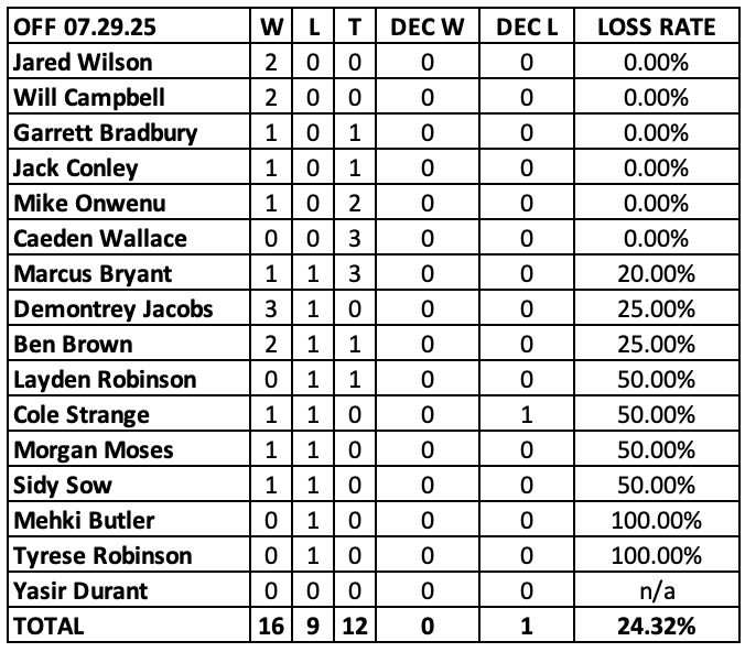LG Cole Strange: At least for today, he fell behind both Wilson and Wallace at LG and had a rough loss in 1-on-1s.