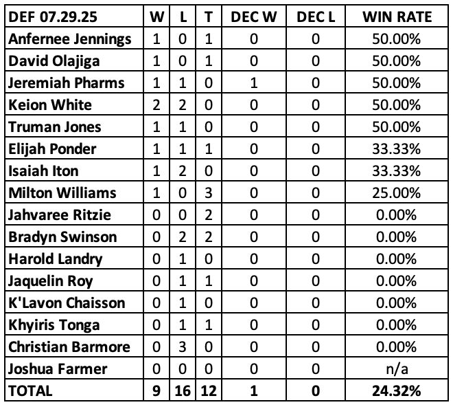 Other reporters had another rep and win for Wilson, but I had that as a Caeden Wallace rep and draw against Milton Williams.