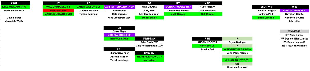 OG Caeden Wallace: Another young player with a dubious future entering camp after a wasted rookie season in which he entered as a possible left tackle, ended up at right tackle and then was switched to left guard entering training camp. It's been a transition, but Wallace has had a solid camp to the point that he apparently has beaten out Cole Strange for backup left guard. And Mike Vrabel actually said nice things about Wallace. “Big, strong, powerful kid, and just looking to put everybody in an opportunity for them to excel and a place to compete, which he’s done,” Vrabel said. “I would say that he’s been headed in the right direction these last couple days since we put pads on. I think he’s gotten more comfortable. I think he’s – they all have – everybody’s going to make mistakes, but I think that there’s been a lot of really positive plays and then continue to move forward.”