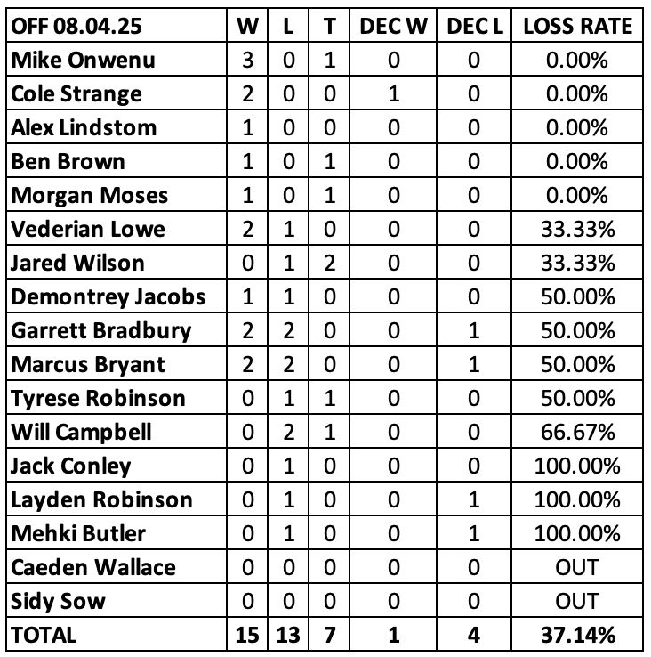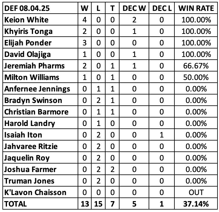 DT Khyiris Tonga, DE Keion White, DE Elijah Ponder: Combined to 9-0 with three decisive wins as they completely dominated. Tonga was also strong in team with a pass break up. White showed fresh legs after three days off (didn't play in the scrimmage) and was a beast going 4-0. Shoutout to Anfernee Jennings for his two sacks in teams.